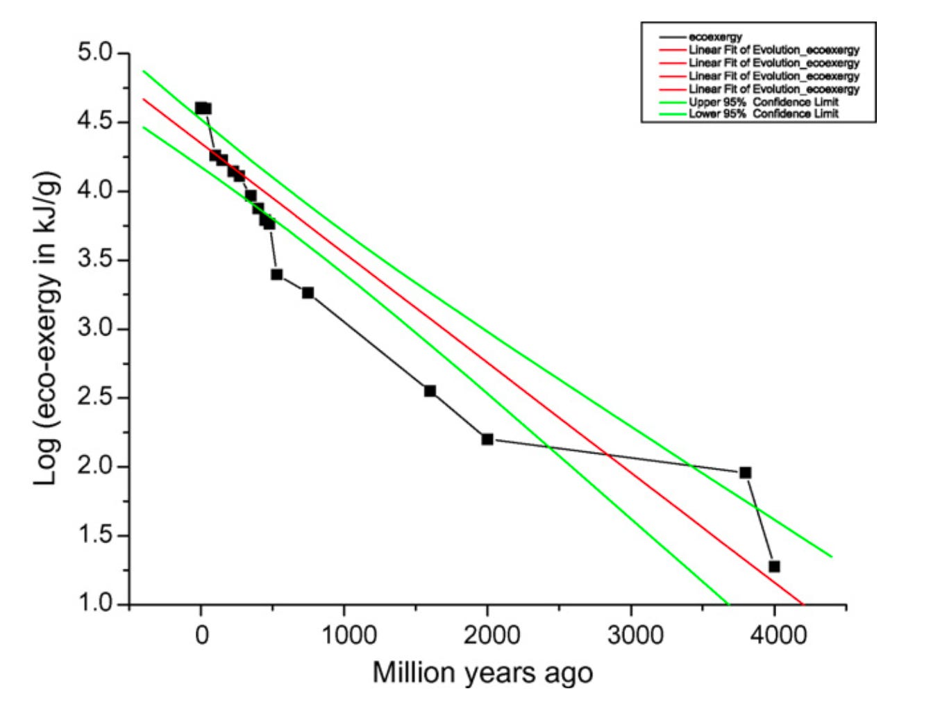 On a log plot, the exponential function appears as a straight line. We can see that life on Earth aligns with the trend line, confirming that the expansion of complexity is exponential.