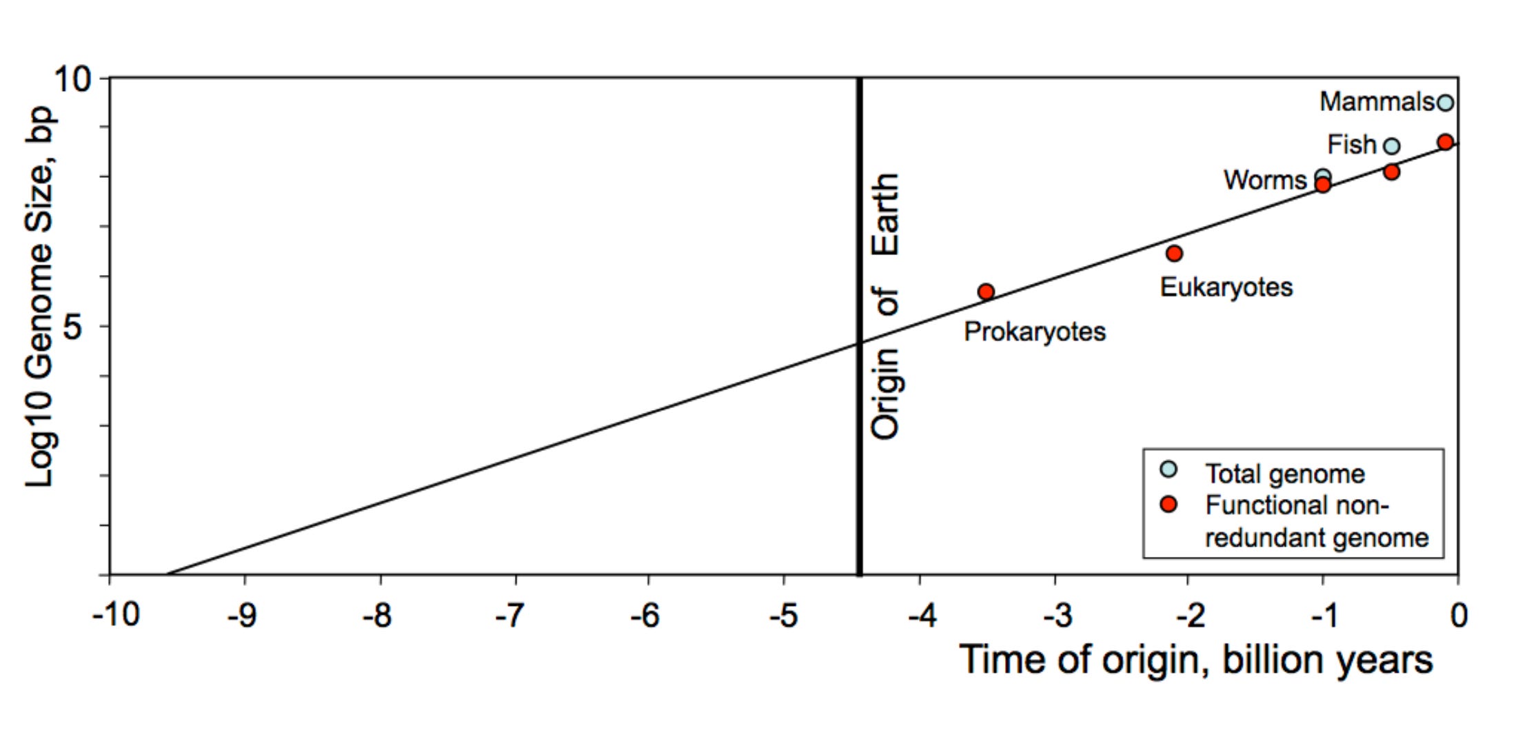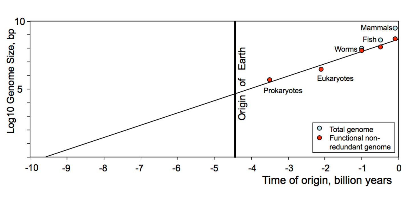 In the paper Life Before Earth, Sharov and Gordon quantified the complexity of life by measuring the amount of functional and coding DNA in organisms’ genomes. They didn’t simply use the size of the whole genome because of the C-value Paradox, which is the puzzling fact that a genome’s size, measured in picograms, doesn’t correspond to complexity. For example, there are single-celled protozoa with genomes much larger than Homo sapiens’.