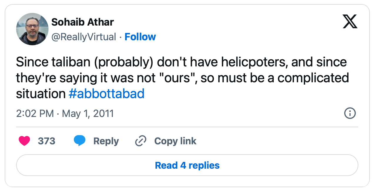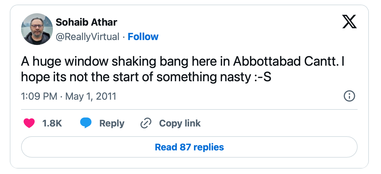 In May of 2011, Sohaib Athar live-tweeted the raid that killed Osama Bin Laden: