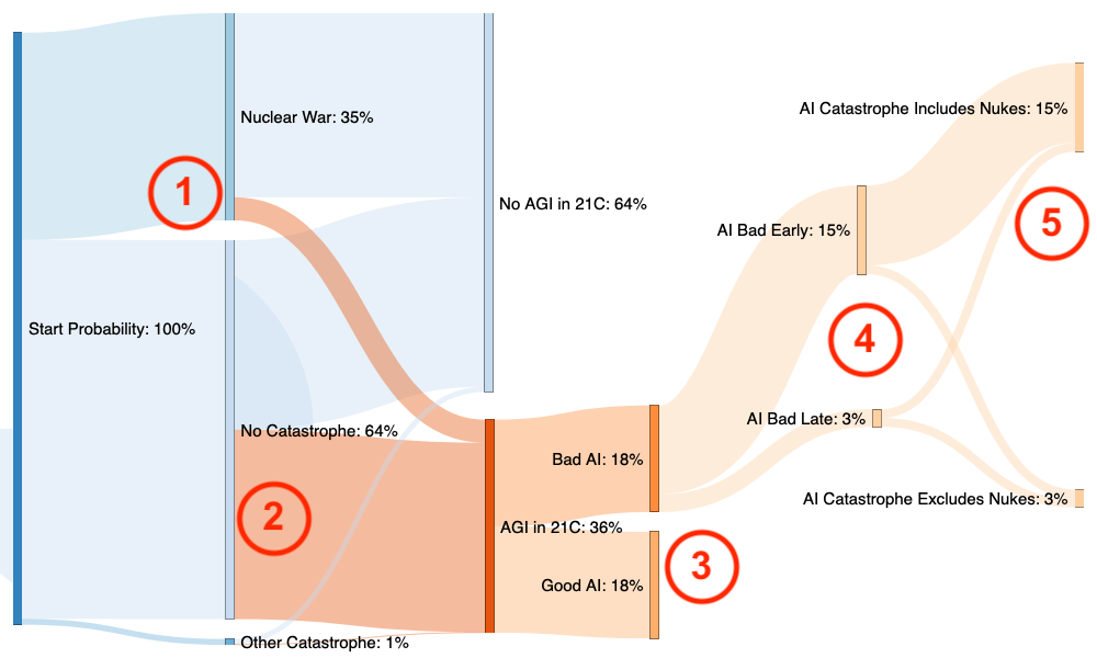 The below Sankey diagram shows how I rate the probability of nuclear and AI outcomes. The exact numbers aren’t important,5 you can even try playing around with them yourself (appendix).