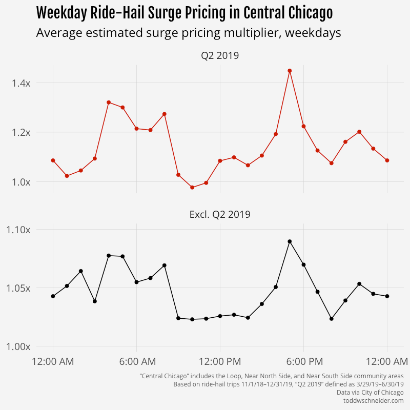 Rideshares are priced according to supply and demand, and users are relatively sensitive to pricing. This means that during peak hours, we’d expect fewer trips as the price rises, unlike private vehicles, which are mostly fixed-cost.